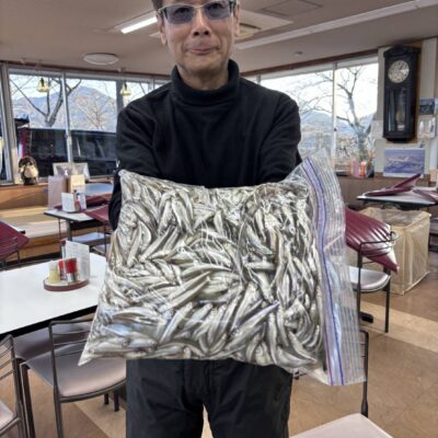 1月12日のワカサギ釣果 □林さん 1400匹 □池田さんグループ 1001匹 □早川さんファミリー