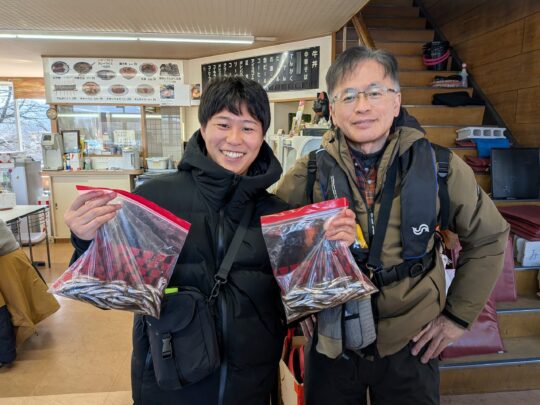 1月7日のワカサギ釣果 □松森さん 1101匹 □鈴木さん 630匹 □新藤さん 250匹 □戸田さ