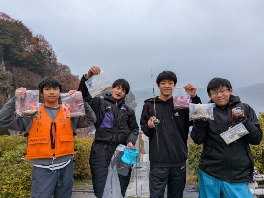 青木君・永浦君・五十川君・屋比久君 公開日:2025.12.21 種類 わかさぎ 日付 2025年12月20日 匹数 94匹 釣場 取水塔東 仕掛け 1.5号・5本針、1号・5本針 えさ 赤ムシ・紅サシ